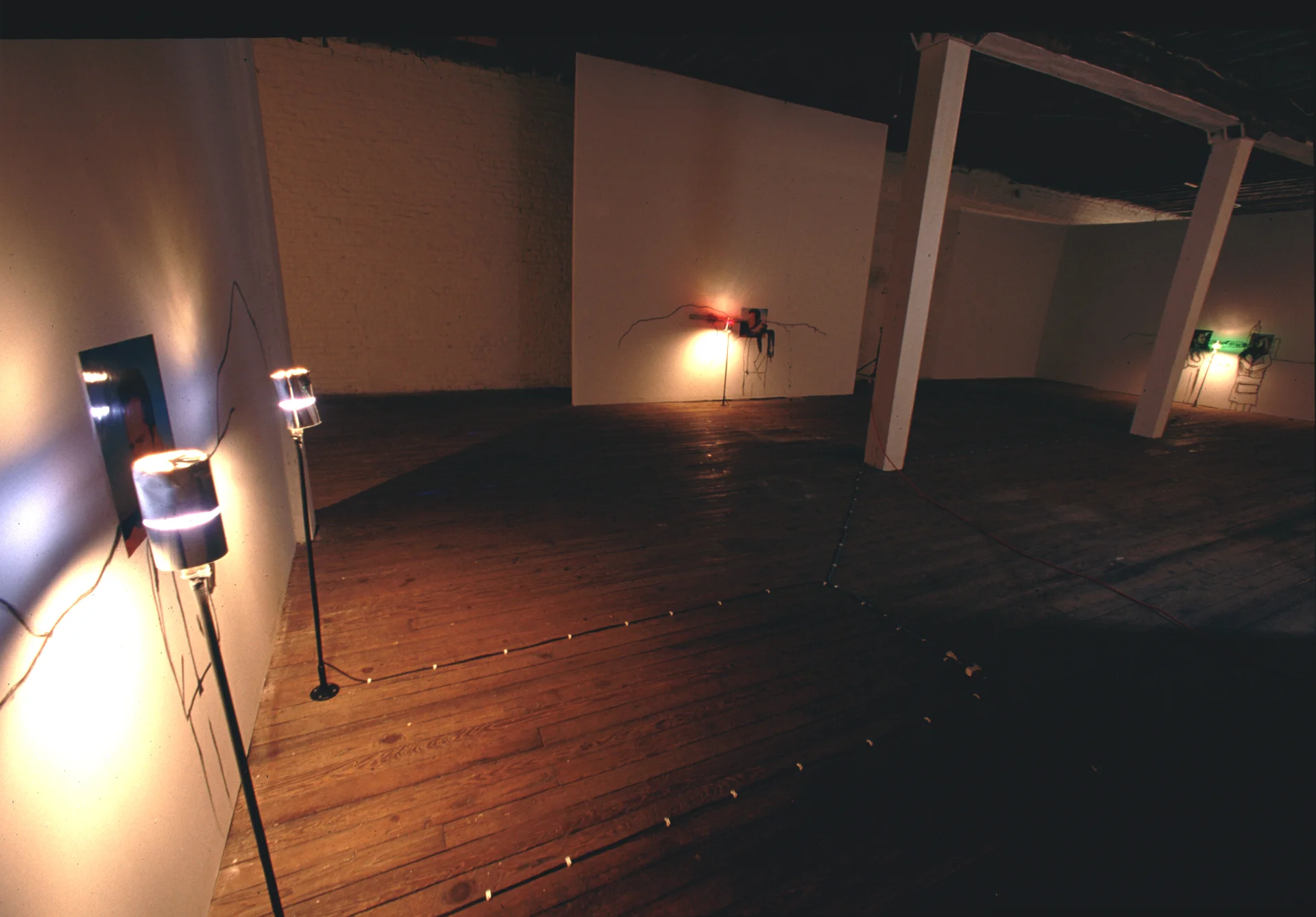 wall mounted photographs, charcoal drawings directly on wall, constructed light projectors, various cords